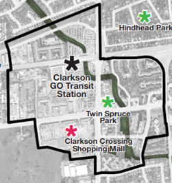 The Clarkson Village study area generally includes the lands east of Walden Circle to Johnson’s Lane and does not overlap with Clarkson GO MTSA.